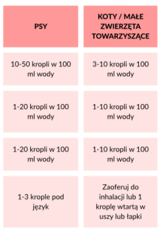 Gdy stosujesz to dawkowanie w misce/wiadrze z wodą, pamiętaj, żeby jednocześnie dać zwierzęciu dostęp do osobnej miski/wiadra bez dodatku hydrolatu. Naczynie z hydrolatem wymieniaj każdego dnia na świeże tak długo jak zwierzę wykazuje nim zainteresowanie. Może robić to poprzez jego wypijanie, inhalację lub leżenie obok miseczki.